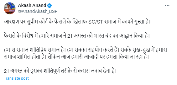 बसपा के नेशनल कोऑर्डिनेटर आकाश आनंद ने X पर लिखा है कि आरक्षण पर सुप्रीम कोर्ट के फैसले के खिलाफ एससी/एसटी समाज में काफी गुस्सा है. अदालत के फैसले के विरोध में हमारे समाज ने 21 अगस्त को भारत बंद का आह्वान किया है.